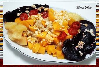 - En un bol, mezclar el arroz, el huevo y el melocotón. Decorar con la remolacha, la piña y los tomatitos.