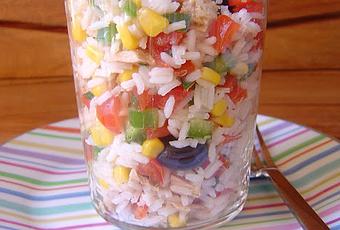 Ingredientes:200 gr de arroz de grano largo 2 tallos de albahaca 2 cucharadas de vinagre de vino una cucharada de mostaza 6 cucharadas de aceite de oliva (AOVE) un pimiento verde 10 tomates cherry 200 gr de atún en aceite de oliva 150 gr de maíz al natural 100 gr de olivas negras deshuesadas sal y pimienta