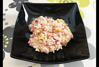 - 100 gr de arroz- 2 latas de atún al natural- 100 gr de maíz- 1 lata de pimiento morrón- 4 cucharadas de mayonesa- 1 cucharada de tomate frito- Sal