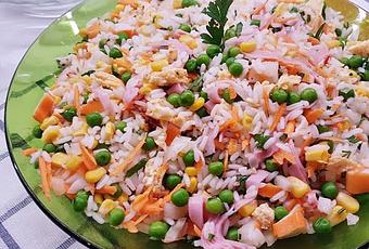 ¡Hoy,vamos a ir al grano!. Con esta fabulosa receta de ensalada de arroz con palitos de surimi y muchas cosas ricas.