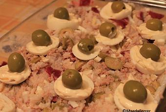 Ingredientes:ArrozAtún en aceiteJamón serranoAceitunas rellenas4 huevosAceite de oliva