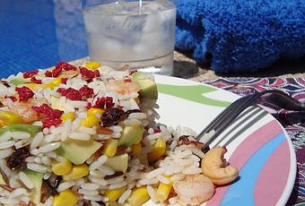 El arroz salvaje tiene que ser bueno para que sea sabroso; he probado marcas blancas y no he encontrado ninguna que me convenza, aunque seguiré en ello, porque no me gusta pagar por pagar...Lo mismo digo de los aguacates y el maíz. Es fundamental que el primero esté en su justo punto de maduración y que tenga sabor; los cogen verdes y luego da lo mismo ponerlos que no. El maíz que esté llenito y no sea una simple cáscara amarilla. Así que toca comprar una buena marca. Las pasas por supuesto sin semillas y las gambas, aunque son congeladas, que no parezcan de corcho. Ya sabéis que hay de todo en el mercado.