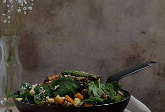 Os traigo para hoy una original receta de ensalada templada con arroz salvaje, espinacas, manzana y calabaza. La acompañaremos con unas almendras tostadas para darle un toque crujiente y tendremos una comida deliciosa, diferente y muy sana. Es ideal para llevar al trabajo o para salir de picnic, con lo que la podemos preparar con antelación. Una ensalada completa, saludable y llena de matices, seguro que se va a convertir en una de vuestras preferidas.