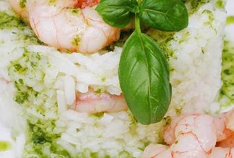 Ingredientes para 4 personas: 250 gr. de arroz largo 250 gr. de gambas peladas 20 hojas de albahaca 1 ajo sal, pimienta negra aceite de oliva virgen extra