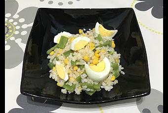Hoy os traemos una ensalada muy original que preparamos como receta de aprovechamiento, ya que nos quedaban unas pocas judías verdes y queríamos utilizarlas antes de que se estropearan.Ingredientes para 2 personas:- 100 gr de judías verdes- 140 gr de arroz integral- 2 huevos- 100 gr de maíz dulce- 3 cucharadas de aceite de oliva- 1 cucharada de vinagre de manzana- 1 cucharada de mostaza- SalReceta:- En una olla, cuece las judías verdes en agua hirviendo con sal durante 15 minutos.- En un cazo con agua hirviendo y una pizca de sal, cuece el huevo durante 10 minutos.- Cuece el arroz integral en otro cazo durante el tiempo que indique el fabricante.- Escurre bien el arroz y las judías.- Corta las judías en trozos y mézclalas en un bol con el arroz.- Pela el huevo cocido y córtalo en gajos.- Escurre el maíz dulce y añádelo al bol.- En otro bol pequeño, mezcla el aceite, el vinagre, la mostaza y una pizca de sal y mezcla bien hasta que la salsa se integre.