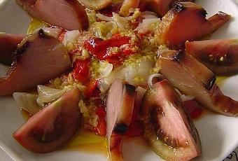 En una fuente de servir se cubre el fondo con el pimiento y la cebolla, alrededor del plato se van intercalando gajos de tomate y lonchas de bonito, y rociamos con el ajo picado con el aceite de oliva.Con respecto a la sal al gusto de cada uno, teniendo en cuenta que el salazón ya está bastante fuerte.