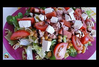 1.- Ponemos la mezcla de ensalada en una fuente o ensaladera. Le añadimos los garbanzos cocidos, las lastas de atún escurrida, los tomates lavados y cortados en cuartos. El queso feta cortado a cuadros y las tiras de membrillo casero. Salpimentamos al gusto, rociamos con un poco de aceite de oliva la crema de vinagre balsámico.