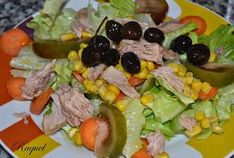 Mirar que colorido tan bonito tiene esta ensalada la típica de verano y que sirve para acompañar cualquier segundo plato, no os parece, a mi me encanta porque tiene maíz.Las ensaladas son perfectas para el verano y apetecen mas, no creéis!!.Ingredientes:Lechuga romanaUn tomateUna zanahoriaUna lata de atúnMedia lata de maízUnas olivas negrasAceite de oliva virgenVinagre de vino blancoSalPreparación:Lavamos bien todas las verduras y cortamos la lechuga y el tomate a trozos, la zanahoria a rodajas.En una ensaladera ponemos la lechuga, el tomate, la zanahoria, el atún, el maíz y las olivas aliñamos con aceite de oliva virgen, sal y vinagre de vino blanco, removemos y a la mesa, ya tenemos lista la ensalada.https://www.facebook.com/midiversionenlacocina