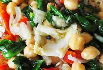 En una sartén ponemos una cucharada de aceite de oliva y salteamos las espinacas, la cantidad al gusto, hacemos un par de minutos y agregamos a la ensalada de garbanzos. Rematamos con el bacalao que tenemos en aceite de oliva, mezclamos y echamos un poco de aceite del bacalao.