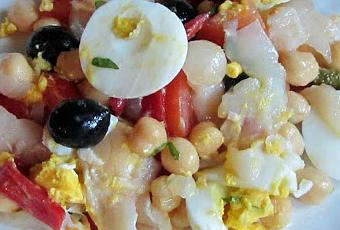 Elaboración Escurrimos bien los garbanzos y los pasamos por un chorro de agua fría para eliminar el sabor del líquido de la conserva. Una vez están bien escurridos, los echamos en una ensaladera.Cortamos en tiras las lonchas de bacalao ahumado y las añadimos a la ensalada. Escurrimos también los pimientos de piquillo, los cortamos en tiras y los incorporamos. Escurrimos los pepinillos, las cebolletas, las alcaparras y las aceitunas y también las agregamos. Antes de hacerlo, cortamos los pepinillos en rodajas y las cebolletas por la mitad. Lavamos bien los tomates, los cortamos en dados y los añadimos. Cocemos los huevos y los dejamos enfriar. Los pelamos, los cortamos y se los agregamos a nuestra ensalada