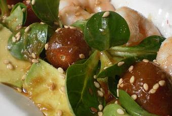 Colocar los berros, los tomates kumato, los trozos de pimiento, el aguacate, las gambas, salsear con la vinagreta y decorar con sésamo…