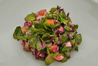 Mezclamos todos los ingredientes: berros, papaya, cebolla, remolacha, aguacate, queso, nueces y papas, en un recipiente y pasamos a preparar la vinagreta.
