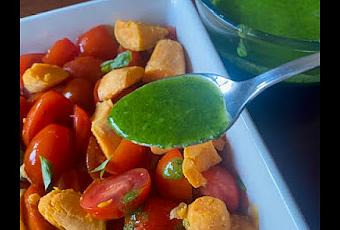 - Mientras preparamos el aliño con la albahaca- Ponemos agua a hervir - Cuando hierva el agua echamos la albahaca y contamos a 15 y sacamos.. La escurrimos e inmediatamente la ponemos debajo del grifo de agua fría y dentro de un colador. Con esta procedimiento nos aseguramos que nuestra salsa no pierda el verde bonito e intenso de la albahaca.