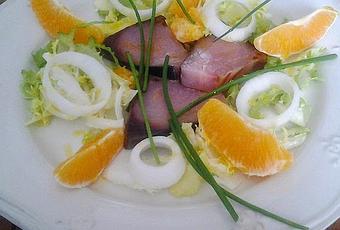 Colocamos el bonito en los platos, añadimos los gajos de naranja, la cebolleta, el cebollino y las hojas de escarola.Regamos con un chorrito de aceite de oliva y una pizca de sal.