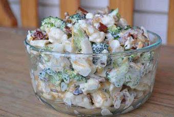 En un recipiente aparte, mezcle la mayonesa, la crema agria, azúcar y sal para hacer un aderezo cremoso Añadir el aderezo a la mezcla de brócoli-coliflor, revolviendo para recubrir de manera uniforme las verduras. Agregue el tocino y el queso, reservando un poco para espolvorear sobre la ensalada justo antes de servir.