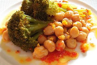 Retirar el tronco más duro del brócoli. Cortar a racimos medianos. Pelar ligeramente los tallos más duros. Lavar bajo el grifo del agua y colocar encima de los garbanzos. Cocinar hasta que la verdura esté al dente.