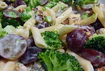 Cocinamos la pasta en abundante agua con sal siguiendo las instrucciones del fabricante. Cuando le falten dos minutos incorporamos el brócoli y dejamos cocinar. Escurrimos y esperamos a que pierdan bien toda el agua. Partimos las uvas por la mitad, les quitamos las pipas. Colocamos todo en una ensaladera, le añadimos las nueces troceadas. Mezclamos muy bien con el aliño que habremos hecho mezclando todos los ingredientes.