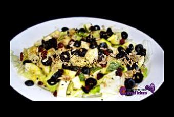 - Las aceitunas las escurrimos y las cortamos a rodajas. Las tiramos encima de las otras verduras.