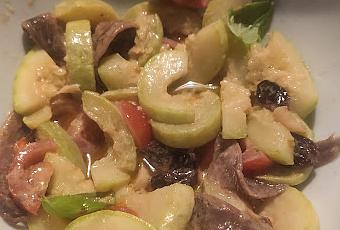 Mientras, en un bol pon una cucharada de mostaza, el vinagre y la sal, añade el tomate cortado en mitad, las anchoas, remueve. E incorpora el salteado (deja templar un poco) y añade las pasas. Remueve todo.