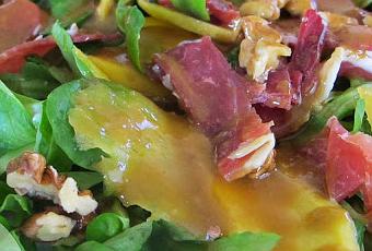 1 bolsa de canónigos1 mango grande100 gramos de jamón ibérico8-10 nuecesAceite de oliva virgen extraVinagre balsámico blanco1 cucharadita de azúcar