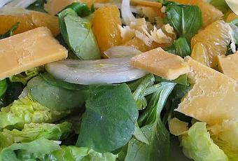 1 o 2 cogollos de lechugaCanonigosCebolla blanca o morada al gusto1-2 mandarinas (si son pequeñas dos)Queso Vinagre de membrillo o vinagre balsámicoAceite de oliva virgen extra