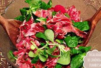 ASÍ LO HICE:- En una fuente coloca los canónigos (previamente lavados y bien escurridos), añade la cajita de frambuesas y el jamón ibérico en tiras. Por último, pica unas 25 hojas de menta y añade una vinagreta de limón, sal y aceite; 4 cucharadas de aceite por una de limón