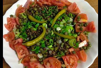 - En una fuente de servicio, colocar en el fondo la lechuga en tiras y sobre ella la cebada cocida ya fría. Repartir los gajos de tomate por el borde de la fuente y sobre los granos de cebada distribuir la cebolleta picada y las alcaparras. Salar y decorar con las piparras. Regar con un generoso chorro de aceite de oliva (también se puede aliñar con una vinagreta o con otra salsa, como el chutney de menta que le va de maravilla).