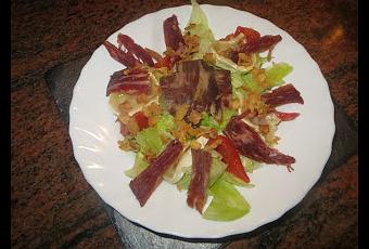 Ingredientes:- 1 rulo de queso de cabra.- 4 lonchas grandes de cecina cortadas en trozos.- ¼ de lechuga iceberg.- Dos tomates.- Un puñado de cebolla frita.- Sal.- Aceite y vinagre o mayonesa.