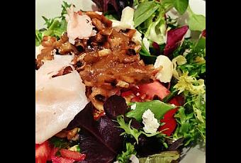 1. Cogemos una mezcla de lechugas y le añadimos tomate cortado muy fino, queso de cabra y fiambre de pavo. 2. Después, pochamos un poco de cebolla y le añadimos azúcar para confitarla. La dejamos a fuego lento hasta que quede bien rendida, y reservamos.3. Cortamos champiñones en trozos muy pequeños, casi picados, y los mezclamos con la cebolla.4. Añadimos a la ensalada esto último.