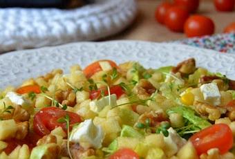 LechugaTomatitos cherryMaíz cocidoMedia manzana tipo Granny SmithNueces Germinados de berros Queso FetaPara el aliño :Ralladura de medio limónMedia cucharada de zumo de limón¼ de cdita de pasta taandori6 cdas de aceite de oliva virgen2 cdas de vinagre de frambuesas Elaboración :Mezclar el aliño batiendo hasta que todo esté bien incorporado .Pelar y cortar la manzana en cuadraditos. También el queso y los tomatitos. Distribuir todos los ingredientes en el plato y verter la vinagreta por encima.
