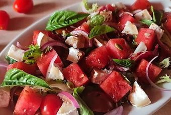 Elaboración:- La elaboración no puede ser más fácil y rápida. Lavamos las verduras y las escurrimos. Colocamos las lechugas en la fuente. Cortamos los tomates y los incorporamos. Hacemos lo mismo con la sandía. Cortamos el queso que distribuimos sobre los demás ingredientes. Repetimos la misma operación con la cebolla. Ponemos por encima las hojitas de albahaca y las semillas. Aliñamos... et voila!