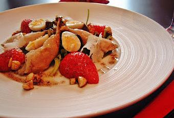Para el montaje de la ensalada, preparamos una base con las lechugas, las aliñamos con un poco del escabeche sin excedernos ya que luego aliñaremos toda la ensalada. Después disponemos 5 muslitos, 3 huevos cortados a la mitad, 2 fresas troceadas, raspamos un poco de parmesano, por último aliñamos con la vinagreta de frutos secos.