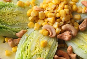 Las ponemos en la base del plato, encima colocamos los cogollos. En el centro ponemos el maíz. Le ponemos la sal y hacemos la vinagreta. Esto va a gustos. Sería una parte de aceite y dos de vinagre. Lo ponemos en un vaso y emulsionamos.