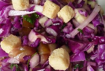 Picamos todos los ingredientes los mezclamos bien. Hacemos la vinagreta con 6 cucharadas de aceite, 2 de zumo de limón, sal y pimienta. Regamos la ensalada y en el momento de servirla le añadimos el pan frito.
