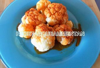 Una coliflor, 3 dientes de ajo, una cucharadita de pimentón dulce, vinagre, aceite de oliva, agua, sal.
