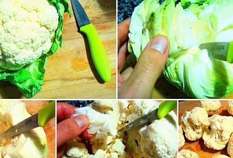 Corta la coliflor en ramilletes - del tamaño de un bocado. Vierte la mezcla de especias sobre la coliflor y remueve hasta que la coliflor esté bien cubierta. Añade los tomates cortados, las rodajas de cebolla y las hojas de laurel.Distribuye las verduras en una sola capa sobre una bandeja para hornear.