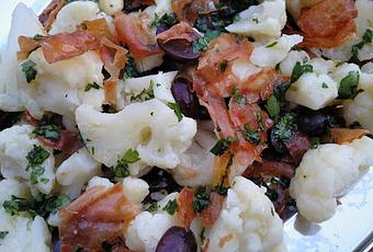 Ingredientes: 1 coliflor pequeña; 8 lonchas jamón serrano; 50 g almendras; 200 g uvas negras; ralladura y zumo de 1/2 limón; 4 cucharadas aceite; 1 cucharadita miel; sal; pimienta.