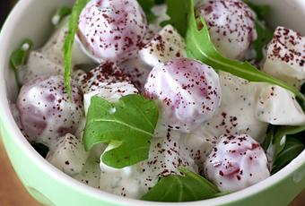 - En la fuente de ensalada ponemos la rúcula haciendo una cama y encima el colinabo con los tomates cherry y el yogurt.