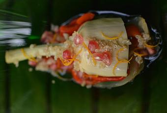 Sobre las verduras pones una alcachofa entera y sobre esta, un poco de quinoa, la granada desgranada, la ralladura y unas gotas del limón que previamente has exprimido, le agregas la sal a tu gusto y sirves, aparte de delicioso, queda extraordinariamente vistoso, es ideal como una entrante para cualquier comida, acompaña con un vino blanco bien fresquito!!