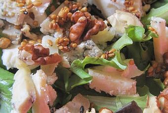La clave está en buscar el contraste entre el dulce de la miel y la reducción de Módena y el sabor salado y lácteo de los quesos.Para esta receta hemos utilizado un queso azul de una granja de La Cerdanya la cual elabora fantásticos quesos de cabra y vaca. Las nueces son de Miravet y el sésamo garrapiñado lo compramos en Zamora esta Semana Santa.