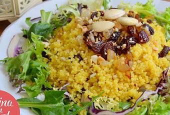 4. Añade ensalada variada en una plato, encima el cous cous y aliña con vinagre de Módena.