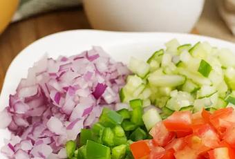 Cortar el trozos pequeños la Cebolla morada, Morrón Verde, Pepino y Tomate. Añadirlos al plato de Cous Cous.