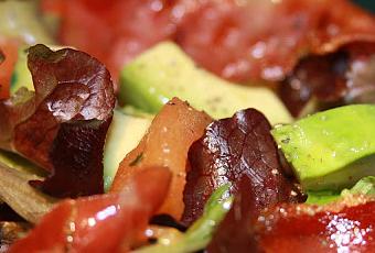 En una fuente ponemos las hojas de ensalada, las tiras de aguacate y las de jamón.