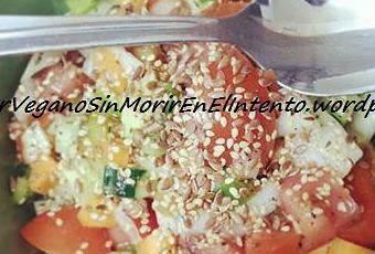 4. Servimos con un poco de albahaca fresca picada encima y semillas de sésamo y lino.