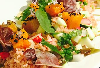 4. Montaje final: en un plato bonito ponemos líneas del aceto de manzana, añadimos una capa generosa de cuscús, las verduras cortadas y la calabaza asada. Yo le puse a cada trocito de calabaza unas semillas de comino negro y una flor de romero, pero eso ya a vuestro gusto. Rociamos un poco más de aceto por encima y listo.