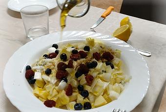 Partir las endibias y poner en el fondo de la ensaladera, pelar la manzana y trocearla, exprimir el limón sobre la manzana, añadir los arándanos y frambuesas, el queso azul troceado y las nueces también troceadas.