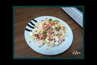 -Endivias-Tomates cherrys-1 lata de atún al natural-1 huevo duro (RECETA)-Aceitunas verdes sin hueso-Palitos de surimi-Aceite de oliva-Vinagre de vino rojo-Sal