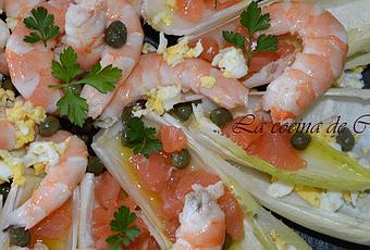 Un paquete de endibiasunas lonchas de salmón ahumadouna lata de huevas de salmónuna docena de gambas cocidasperejil picadouna cucharada sopera de alcaparrasun huevo duro picadoaceite de olivavinagre de Jerezzumo de 1/2 limónsal y pimienta
