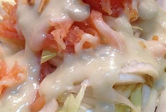 Elaboración: En un cazo pequeño ponemos a cocer a fuego lento y cuando esté deshecho, hechamos poco a poco la nata, removiendo y mezclando bien. Se desprenden 4 hojas de endivia situandolas en cruz en un plato. Troceamos en juliana otras tres hojas y colocamos en el centro de la cruz. Cortamos finito el salmón y ponemos encima. Deoramos con almendra crocanti.