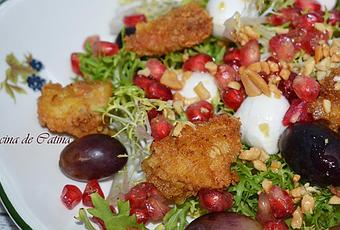En una fuente ponemos la escarola y agregamos las uvas, los granos de la granada y las perlas de mozzarella cortadas.
